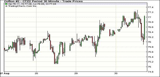 8月30日,雖然颶風“艾薩克”已經(jīng)降級為熱帶風暴,但其破壞力還將持續(xù),同時美棉出口數(shù)據(jù)較好對市場形成支持,紐約期棉受支持繼續(xù)收漲,近期10月合約收于76.15美分/磅,漲32點;主力12月合約結(jié)算價76.94美分/磅,漲29點。當日市場平穩(wěn)開盤,主力合約早盤在美棉出口數(shù)據(jù)利好支持下震蕩走高,盤中基本圍繞76.60美分/磅上下震蕩,交易后半段交易商獲利平倉,打壓市場走低;但買盤在尾盤時分入市促市場反彈,盤終該合約小幅收漲。當日外部市場漲跌不一,玉米及大豆收漲,小麥及原油期貨收跌。美國聯(lián)邦儲備委員會主席貝南克將于周五發(fā)表演講,市場將從其講話中尋求Fed再次推出寬松措施的信號。