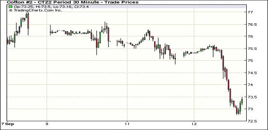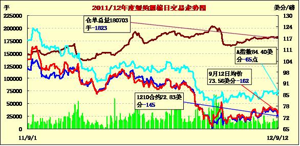 9月12日,雖然美元指數(shù)收跌,美國股市、大豆和小麥期貨收強(qiáng),但紐約期棉市場受USDA(美國農(nóng)業(yè)部)供需報(bào)告利空影響,全面大跌,近期10月合約結(jié)算價(jià)72.83美分/磅,跌145點(diǎn),主力12月合約73.33美分,跌160點(diǎn)。市場總成交增加。前兩個(gè)交易日市場因預(yù)期USDA9月份報(bào)告將利空而連續(xù)下跌,12日市場延續(xù)悲觀氣氛,市場早盤試圖維持住75美分支撐位,但交易未過半市場出現(xiàn)大跌,先后跌破74美分和73美分,最終收于73美分一線水平。德國法院的裁決支持了歐元區(qū)救援基金,加上市場對美聯(lián)儲(chǔ)推出經(jīng)濟(jì)刺激政策較為樂觀,美元指數(shù)大幅下跌,美國股市和商品市場普遍走強(qiáng),但USDA報(bào)告中就將全球棉花期末庫存大幅調(diào)高,紐約期棉明顯承壓。
