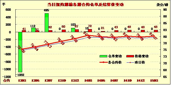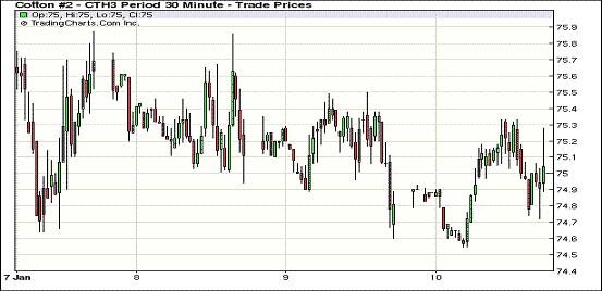 1月10日,紐約期棉受美棉出口增加和裝運進度有所加快影響全面收漲,近期3月合約結算價75.20美分/磅,漲41點,1305月合約76.04美分,漲37點。當日3月合約早盤圍繞前一日低點波動,交易中期和后期繼續(xù)在75美分處尋求支撐,美棉出口周報利好,市場表現(xiàn)穩(wěn)定,3月合約終收于近高點。 據(jù)美國農(nóng)業(yè)部(USDA),12.28-1.3一周美國凈簽約出口本年度陸地棉44566噸,較前一周增9%,裝運58219噸,較前一周增41%。