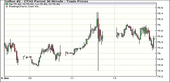 1月14日,紐約期棉缺乏方向指引呈盤整格局,主力1303月合約結(jié)算價75.52美分/磅,跌10點;1305月合約結(jié)算價76.36美分/磅,跌4點。成交量較上周五有所下滑。當(dāng)日市場平穩(wěn)開盤,早盤短暫走高后受賣盤打壓回落,主力合約在午盤前后至當(dāng)日最低點75.12美分/磅;后在外圍谷物商品走高提振下反彈,尾盤時分賣盤再次入市打壓該合約回落,盤終微幅收跌。當(dāng)日外部谷物及原油市場普遍收漲。