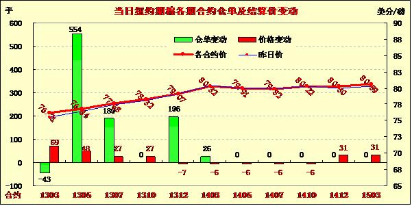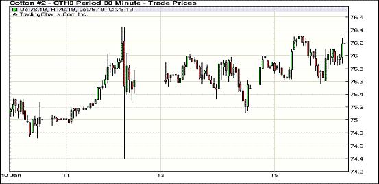 1月15日,紐約期棉漲跌互現(xiàn),主力1303月合約收于76.21美分/磅,漲69點(diǎn);1305月合約結(jié)算價(jià)76.84美分/磅,漲48點(diǎn);其他遠(yuǎn)期合約小幅收漲或微幅收跌。棉花基本面持續(xù)低迷,下年度植棉面積縮減及澳大利亞持續(xù)高溫或?qū)π禄ㄔ斐蓳p害對(duì)期棉形成支持。當(dāng)日市場(chǎng)平穩(wěn)開(kāi)盤(pán),主力合約早盤(pán)上行至當(dāng)日最高點(diǎn)76.30美分/磅,未能觸及上周五的高點(diǎn)76.44美分;后賣(mài)盤(pán)涌入打壓市場(chǎng)回落,尾盤(pán)時(shí)分又在谷物市場(chǎng)走高支持下反彈,盤(pán)終該合約收于12月26日以來(lái)最高值。當(dāng)日外部玉米及小麥?zhǔn)袌?chǎng)收漲,大豆及原油市場(chǎng)走低。