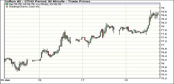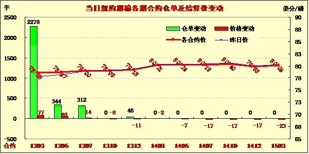 1月18日,紐約期棉前三份合約受投機買盤支持繼續(xù)收漲,主力1303月合約78.55美分/磅,漲77點;1305月合約結(jié)算價78.67美分/磅,漲48點;1307月合約收于79.00美分/磅,漲14點;其他遠(yuǎn)期合約普遍小幅收跌。紐約市場下周一(1月21日)將因馬丁路德金日公共假期休市一天。當(dāng)日市場早盤運行平穩(wěn),主力合約在77.6-77.8美分之間窄幅震蕩,午盤后投機買盤入市促市場大幅上揚,該合約突破78美分阻力位,盤終收于2012年5月10日以來最高值,該合約本周累計漲293點,漲幅3.9%;1305月合約累計漲227點;1307月合約累計漲159點。中國目前正在進行儲備棉的投放工作,市場反應(yīng)紡企對投放的儲備棉質(zhì)量不滿,傾向于采購進口棉,這對美盤形成支持。