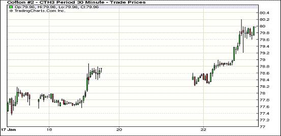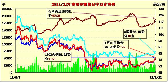 1月22日,受美元指數(shù)走弱、外部商品市場多數(shù)上漲及美棉下年度面積銳減支持,紐約期棉大幅上揚(yáng),主力1303月合約收于79.93美分/磅,漲138點(diǎn);1305月合約結(jié)算價(jià)80.08美分/磅,漲141點(diǎn);其他遠(yuǎn)期合約也普遍大幅或中幅收漲。當(dāng)日市場穩(wěn)開高走,美指走弱及市場炒作美棉面積大減促主力合約一路上揚(yáng),該合約在下半場于2012年5月以來首次突破80美分/磅,當(dāng)日最高至80.20美分/磅,盤終雖略有回落但終以大漲收盤。當(dāng)日外部大豆市場也大幅收漲。預(yù)測機(jī)構(gòu)Informa預(yù)計(jì)美棉下年度面積為1027.7萬公頃,同比減16.6%;美國國家棉花總會(huì)(NCC)植棉意向調(diào)查數(shù)據(jù)將于周三公布,市場保持關(guān)注。
