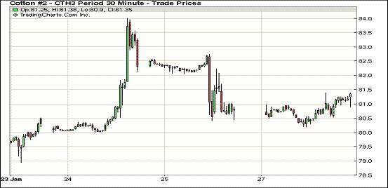 1月25日,紐約期棉近期合約一改近期的強勢上揚勢頭大幅收跌,主力1303月合約80.52美分/磅,減237點;1305月合約結(jié)算價80.48美分/磅,減172點;1307月合約收于80.40美分/磅,減64點;其他遠期合約微幅盤整。市場嚴重超買及美棉簽約量下降是打壓近期合約大跌的主要原因。當日市場中幅低開,主力合約早盤主要在82-82.5美分之間窄幅震蕩,因該合約在過去10個交易日中持續(xù)上揚,市場處于嚴重超買狀態(tài),下半場買家獲利平倉打壓市場大幅走低,該合約盤中收跌200余點,但本周累計漲197點,漲幅2.5%;1305月合約累計漲181點;1307月合約累計漲140點。