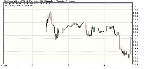 1月4日,紐約期棉市場(chǎng)隨外部商品市場(chǎng)一并下跌,美元指數(shù)上漲給予整體壓力,近期3月合約結(jié)算價(jià)75.05美分/磅,跌34點(diǎn)。當(dāng)日3月合約平穩(wěn)開(kāi)盤(pán)后上半場(chǎng)交易在75美分-76美分間波動(dòng),盤(pán)中因獲利了結(jié)盤(pán)打壓大幅下跌,該合約先后洞穿75和74美分,最低跌至73.72美分(-167點(diǎn)),交易后期受空頭平倉(cāng)支持最終反彈至75美分以上。美元上漲,外部商品市場(chǎng)一并下跌,期棉難以獨(dú)善其身,市場(chǎng)基本面需求清淡,短期內(nèi)市場(chǎng)向上壓力不小。