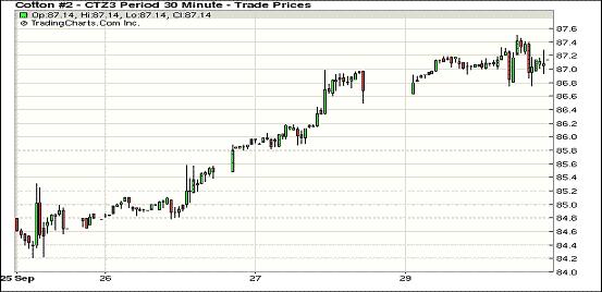 9月30日,因美國(guó)風(fēng)暴天氣引發(fā)市場(chǎng)對(duì)其作物進(jìn)一步受損的擔(dān)憂,紐約期棉連續(xù)第五個(gè)交易日走高,近期10月合約結(jié)算價(jià)86.11美分/磅,漲45點(diǎn);主力12月合約結(jié)算價(jià)87.21美分/磅,漲58點(diǎn);遠(yuǎn)期3月合約收于86.98美分/磅,漲64點(diǎn)。當(dāng)日市場(chǎng)平穩(wěn)開盤,12月合約早盤圍繞87.1美分上下波動(dòng),后因美國(guó)太平洋風(fēng)暴正在醞釀,可能威脅美國(guó)主要棉花產(chǎn)區(qū)德州的棉花收成,并導(dǎo)致當(dāng)?shù)匦禄ú烧吧鲜型七t,投機(jī)資金入市促使市場(chǎng)上揚(yáng),盤終該合約收于8月20日以來(lái)最高值,其他合約也均以上漲收盤。市場(chǎng)成交量較前一日縮小。分析指出,主力12月合約9月份累計(jì)漲372點(diǎn),漲幅4.5%;第三季度(7-9月)漲幅為2.4%。目前美國(guó)棉區(qū)風(fēng)暴天氣、中國(guó)政策及印度棉區(qū)遭遇強(qiáng)降雨對(duì)期棉市場(chǎng)提供支持。