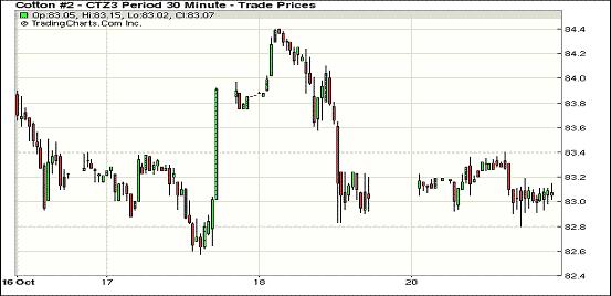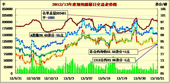 10月21日,受登記庫存增加打壓,紐約期棉連續(xù)第二個交易日收跌,主力12月合約結(jié)算價83.06美分/磅,跌5點;1403月合約收于84.25美分/磅,跌7點。當日市場平穩(wěn)開盤,主力12月合約早盤在83.2-83.3美分/磅之間窄幅震蕩,午盤后震蕩區(qū)間下行至83美分,受供應(yīng)增加影響,該合約盤終收于9月5日以來最低點。當日大豆及玉米期貨走高,小麥及原油市場收跌。