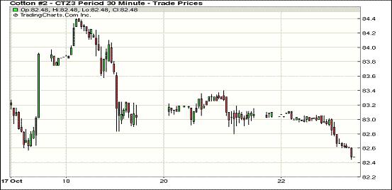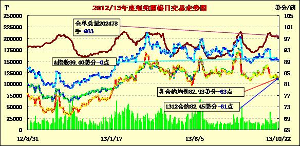 10月22日,因印度棉花協(xié)會調(diào)高印度2013/14年度棉花產(chǎn)量及美國天氣利好新花優(yōu)良率同比上升,紐約期棉受打壓連續(xù)第三個交易日收跌,主力12月合約結(jié)算價82.45美分/磅,跌61點(diǎn);1403月合約收于83.72美分/磅,跌53點(diǎn)。當(dāng)日主力合約平開低走,在交易最后10分鐘至當(dāng)日最低點(diǎn)82.44美分/磅,盤終反彈一個點(diǎn)收于七周低位。該合約過去兩個月在82.11-87.75美分/磅之間震蕩,目前已下行至該區(qū)間底部。3月合約較12月合約升水走寬至127點(diǎn),較前一日增8點(diǎn)。分析指出,據(jù)印度棉花協(xié)會(CAI)最新預(yù)測,其13/14年度產(chǎn)量由此前的3750萬包(637.5萬噸)調(diào)增至3810萬包(647.7萬噸)。據(jù)USDA,美棉新花優(yōu)良率為44%(優(yōu)秀10%,良好34%),較去年同期增兩個百分點(diǎn),目前各棉區(qū)天氣良好,新花采摘工作順利進(jìn)行。