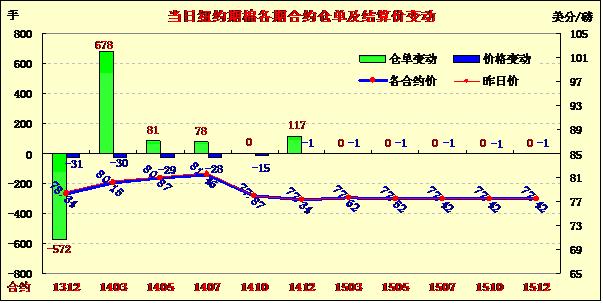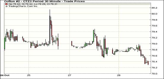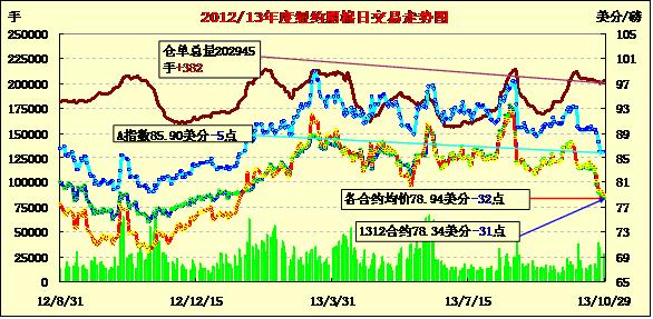 10月29日,在北半球新花上市量增加的壓力下,紐約期棉連續(xù)第八個交易日收跌,錄得五月來最長跌勢。主力12月合約結(jié)算價78.34美分/磅,跌31點;1403月合約收于80.15美分/磅,跌30點。當(dāng)日期棉微幅高開,主力12月合約上半場圍繞78.8美分/磅上下震蕩;新花上市增加壓力繼續(xù)對市場形成壓力,市場在午盤后持續(xù)下行,該合約當(dāng)日最低至78.29美分/磅,盤終雖略有回調(diào),仍收于2012年12月28日(78.11美分/磅)以來最低值。當(dāng)日外部股市及谷物市場收高。交易商認(rèn)為,78美分水平是下一波技術(shù)性拋售的觸發(fā)位,可能使12月合約跌至去年11月以來最低75.5美分。貿(mào)易商關(guān)注本周召開的中儲棉會議。