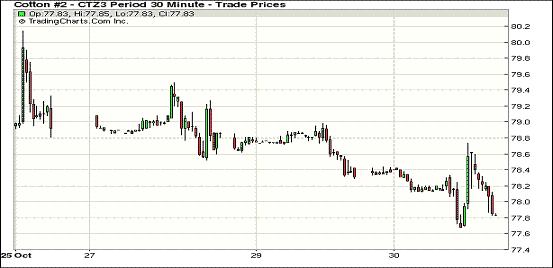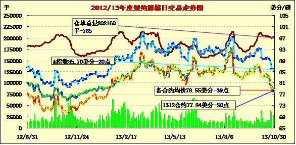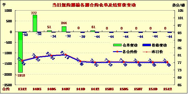 9月30日,受北半球新花上市量增加及基金移倉交易打壓,紐約期棉連續(xù)第九個交易日收跌,主力12月合約結(jié)算價77.84美分/磅,跌50點;1403月合約收于79.83美分/磅,跌32點。市場交易活躍,成交量超過3萬手。當日市場平穩(wěn)開盤后小幅下行,主力12月合約圍繞78.2美分/磅窄幅震蕩;午盤后該合約跌至低點后,在買盤支持下反彈至當日最高點78.73美分/磅,此時指數(shù)基金移倉(由12月合約移向3月合約)拖累期棉回落,盤終12月合約收于2012年12月13日(77.63美分/磅)以來最低值。當日外部商品市場漲跌互現(xiàn)。美國農(nóng)業(yè)部(USDA)將于今晚公布10.4-10、10.11-17及10.18-24三周的美棉出口銷售數(shù)據(jù),市場保持關注。