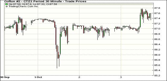 10月3日,紐約期棉在外部谷物市場(chǎng)走高帶動(dòng)下連續(xù)第二個(gè)交易日收漲,主力12月合約結(jié)算價(jià)87.60美分/磅,漲73點(diǎn);遠(yuǎn)期3月合約收于87.37美分/磅,漲58點(diǎn)。當(dāng)日主力12月合約早盤(pán)在87美分/磅上下震蕩,午盤(pán)時(shí)分技術(shù)買(mǎi)盤(pán)及外部谷物市場(chǎng)走高帶動(dòng)期棉上行,該合約突破近期高位,當(dāng)日最高至87.78美分,尾盤(pán)雖略有回落,盤(pán)終仍收于六周新高。分析指出,美中南及東南棉區(qū)降雨不利于新花吐絮及采摘,德州平原晴朗天氣加速新花快速成熟。