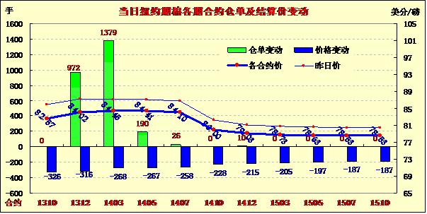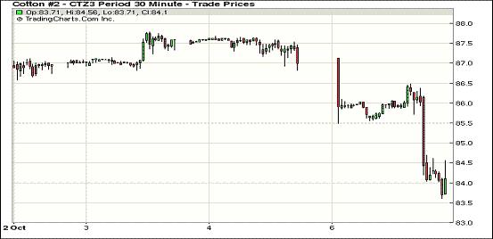 當(dāng)日主力12月合約開盤較為平穩(wěn),早盤在86美分/磅上下波動,后因熱帶風(fēng)暴減弱,市場對美棉區(qū)受損的擔(dān)憂減弱導(dǎo)致期棉市場下行,同時(shí)獲利了結(jié)及止損賣盤入市打壓棉價(jià)迅速下跌,該合約跌破84美分,當(dāng)日最低至83.60美分/磅,盤終錄得六周來最大單日跌幅。