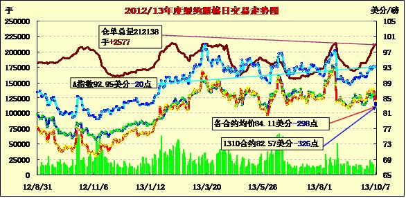10月7日,因市場對美國棉區(qū)受熱帶風(fēng)暴損害的擔(dān)憂緩解,紐約期棉全面大跌,近期10月合約結(jié)算價(jià)82.57美分/磅,跌326點(diǎn);主力12月合約結(jié)算價(jià)84.02美分/磅,跌316點(diǎn);遠(yuǎn)期3月合約收于84.45美分/磅,跌268點(diǎn);其他遠(yuǎn)期合約跌幅197-267點(diǎn)不等。