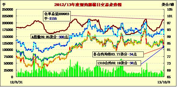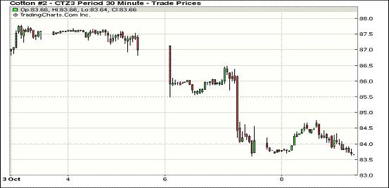 10月8日,紐約期棉延續(xù)前一日的跌勢(shì)繼續(xù)走低,近期10月合約結(jié)算價(jià)82.19美分/磅,跌38點(diǎn);主力12月合約結(jié)算價(jià)83.69美分/磅,跌33點(diǎn);遠(yuǎn)期3月合約收于84.15美分/磅,跌30點(diǎn)。當(dāng)日市場(chǎng)平穩(wěn)開(kāi)盤(pán),主力12月合約早盤(pán)在買(mǎi)盤(pán)推動(dòng)下上行至當(dāng)日高點(diǎn)84.75美分/磅,下半場(chǎng)受市場(chǎng)對(duì)天氣擔(dān)憂減弱及美國(guó)聯(lián)邦政府停運(yùn)等因素影響持續(xù)走低,盤(pán)終小幅收跌。12/3月合約價(jià)差46點(diǎn)。當(dāng)日外部谷物市場(chǎng)也普遍走低。分析指出,美國(guó)熱帶風(fēng)暴減弱,并未對(duì)棉區(qū)造成損害;美政府停運(yùn)進(jìn)入第二周,投資者保持警惕;同時(shí)圍繞聯(lián)邦債務(wù)撞線和國(guó)債違約的擔(dān)憂打壓股市及外部商品市場(chǎng)普遍走低,期棉在上述因素影響下維持跌勢(shì)。