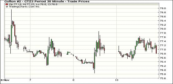 11月11日紐約期棉遠近合約漲跌不一。主力3月合約結算價78.20美分/磅,跌44點;1405月合約收于78.89美分/磅,跌44點。