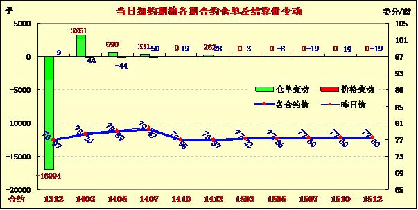 當日12月合約開盤平穩(wěn),最高漲至77.64美分/磅,該合約臨近下周五交割通知日,盤終收于76.97美分/磅,略微上漲9點,主力3月合約盤中收跌,市場成交仍持續(xù)活躍,3月較12月合約升水123點,大豆和玉米期貨大幅上漲。
