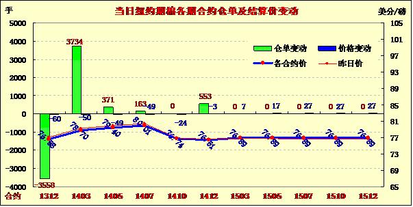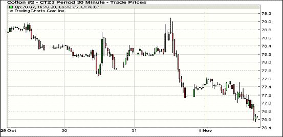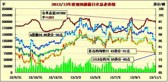 11月1日,紐約期棉連續(xù)第11個交易日下跌;主力12月合約結算價76.58美分/磅,跌60點;1403月合約收于78.70美分/磅,跌50點。當日期棉早盤波動不大,主力12月合約先漲后跌,盤終跌60點,該合約已連續(xù)四周下跌,自十月份達到高點后累計跌幅12.8%,逼近一年來低位;市場成交量放大,因美元指數(shù)持續(xù)上漲,外部谷物市場多下跌。本周期棉仍持續(xù)下滑,預計將創(chuàng)最長下跌紀錄;全球棉花供應量上升,棉價上漲支撐有限;強降雨影響中南棉區(qū)三角洲棉花采摘。
