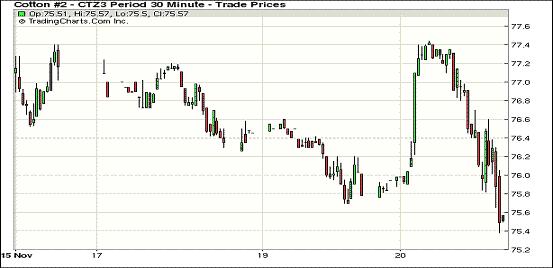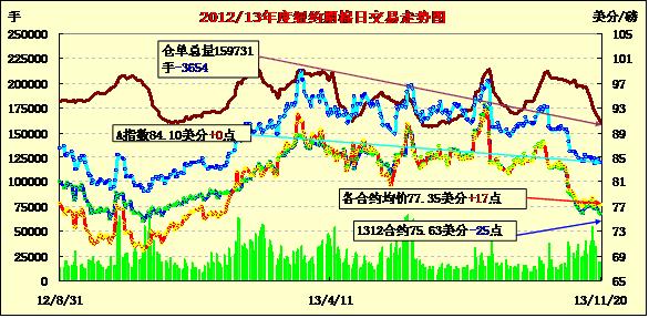 11月20日,紐約期棉除近期12月合約下跌外,其余合約均普遍上漲;主力12月合約結算價75.63美分/磅,跌25點;1403月合約收于78.14美分/磅,漲58點。當日期棉開盤后遠近合約均上漲反彈,近期12月合約漲幅較小,最高漲至77.44美分,主力3月合約漲勢明顯,最高79.45美分,最低77.62美分,震蕩區(qū)間183點,3月較12月合約升繼續(xù)走寬至251點,外部市場漲跌不一。近期12月合約交割日臨近,本月期棉持續(xù)在75-78美分之間震蕩運行,中國本年度棉花產量預計下降,拋儲時間未定令棉價承壓;全球棉花供應上升,需求增長緩慢,棉價上漲支撐有限。