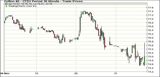 11月21日,紐約期棉延續(xù)前一日走勢(shì),近期12月合約下跌,其余合約上漲;主力12月合約結(jié)算價(jià)74.79美分/磅,跌84點(diǎn);1403月合約收于78.35美分/磅,漲21點(diǎn);1405月合約收于78.88美分/磅,漲26點(diǎn)。由于市場(chǎng)賣盤,期棉開盤后除近期12月合約小幅下跌外,遠(yuǎn)期合約均上漲,主力3月合約在78美分之上震蕩運(yùn)行,3月較12月合約升繼續(xù)走寬至356點(diǎn)。盡管美棉出口簽約量低于上周,21日期棉仍上漲,全球高庫(kù)存持續(xù)令棉價(jià)承壓。
