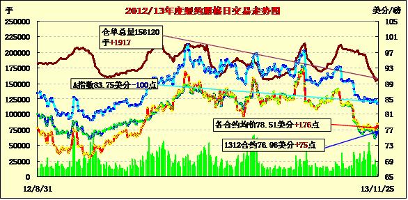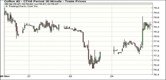 11月25日,在外部谷物商品市場普遍走高帶動(dòng)下,紐約期棉收復(fù)上周五失地全面反彈,近期12月合約結(jié)算價(jià)76.96美分/磅,漲175點(diǎn);主力3月合約收于78.46美分/磅,漲123點(diǎn);其他遠(yuǎn)期合約漲幅40-108點(diǎn)不等。當(dāng)日市場開盤較為平穩(wěn),主力3月合約上半場圍繞77.6美分/磅上下震蕩;午盤后外部商品市場走高促期棉上行,該合約當(dāng)日最高至78.84美分/磅(+161點(diǎn));交易后半場在78.4美分一線徘徊,盤終收于兩周以來高點(diǎn)。