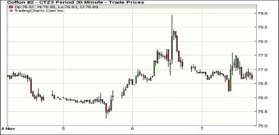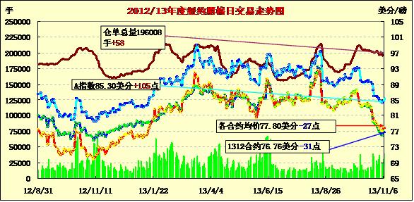 前一日反彈上漲過(guò)后,由于上升動(dòng)力不足,11月7日紐約期棉再度小幅下跌。主力12月合約結(jié)算價(jià)76.76美分/磅,跌31點(diǎn);1403月合約收于78.86美分/磅,跌33點(diǎn)。當(dāng)日期棉開盤后短暫上行,不過(guò)由于隨后公布的美棉出口數(shù)據(jù)大增,全球供應(yīng)上升及美棉豐產(chǎn),期棉再度盤終收跌,主力12月合約最高漲至77.74美分/磅,最低76.22美分/磅,外部市場(chǎng)漲跌不一。分析指出,市場(chǎng)近期超賣嚴(yán)重,一旦跌破75美分支撐,下一個(gè)支撐點(diǎn)可能在70-65美分之間,市場(chǎng)等待今日發(fā)布的USDA供需報(bào)告。