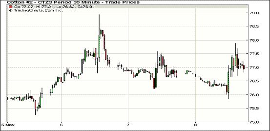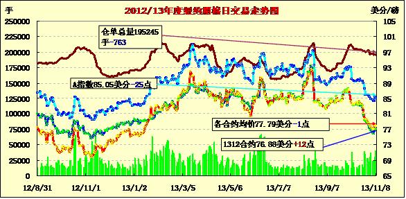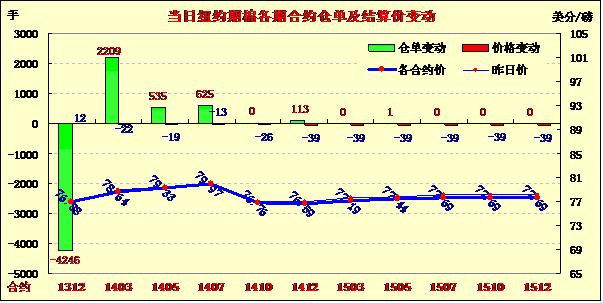 11月8日,紐約期棉除12月合約上漲外,其余合約均普遍下跌;主力12月合約結(jié)算價(jià)76.88美分/磅,漲12點(diǎn);1403月合約收于78.64美分/磅,跌22點(diǎn)。當(dāng)日12月合約早盤(pán)略有上漲,最高漲至77.88美分,最低75.85美分,盤(pán)終略微收漲;3月取代成為12月成為主力合約,盤(pán)終下跌22點(diǎn),3月較12月合約升水176點(diǎn),較周四的210點(diǎn)拉窄,市場(chǎng)成交量放大。