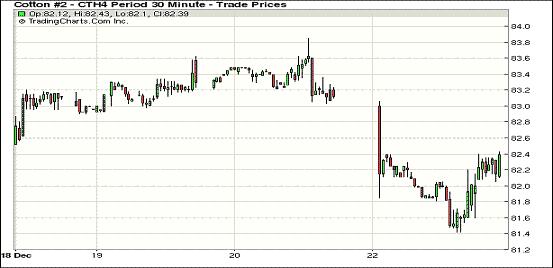 12月23日,由于市場(chǎng)缺乏足夠利好支撐,期棉普遍下跌;主力3月合約結(jié)算價(jià)82.24美分/磅,跌91點(diǎn);1405月合約收于82.14美分/磅,跌77點(diǎn);1405月合約收于82.18美分/磅,跌71點(diǎn)。當(dāng)日期棉早盤整體下跌,主力3月合約跌幅較大,午盤后買盤增多雖略有反彈,但盤終仍收跌91點(diǎn),外部谷物市場(chǎng)同樣普遍下跌;假日因素制約市場(chǎng)成交。