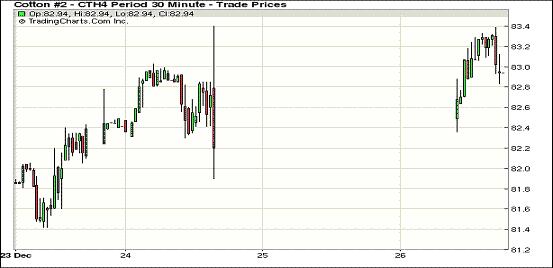 12月26日,紐約期棉近跌遠漲,主力3月合約結(jié)算價82.89美分/磅,跌29點;5月合約結(jié)算價82.62美分/磅,跌19點。受節(jié)日氣氛影響,市場成交極為清淡,成交量僅5000余手。在25日休市一天之后,26日期棉市場延續(xù)24日漲勢小幅高開,主力3月合約大部分時段在83-83.4美分之間震蕩,尾盤時分外部谷物商品市場走低對期棉形成壓力,該合約回落并以陰跌收盤。多數(shù)貿(mào)易商在節(jié)日期間離場,導(dǎo)致市場成交清淡。分析指出,受圣誕節(jié)假期影響,美棉出口周報推遲至本周五晚公布,市場預(yù)期上周出口量下降。