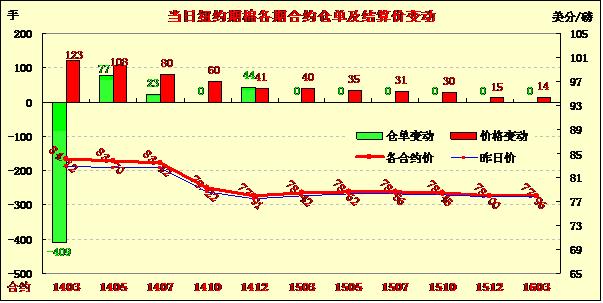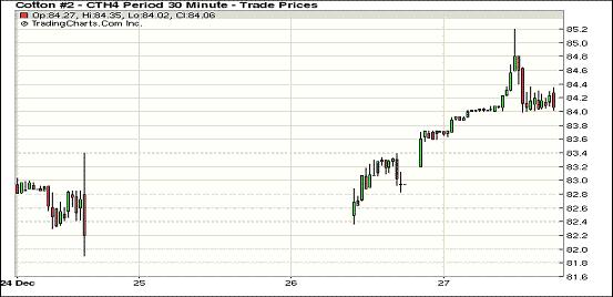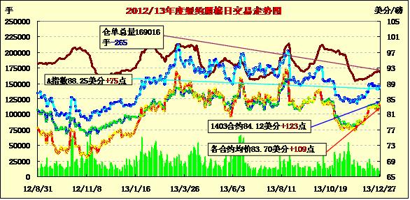 12月27日,因上周美棉出口數(shù)據(jù)超出市場預期,紐約期棉受支持大幅上漲,主力1403月合約收于84.12美分/磅,漲123點;1405月合約結算價83.70美分/磅,漲108點;其他遠期合約漲幅15-80點不等。當日主力合約平穩(wěn)開盤,早盤在84美分一線窄幅震蕩,午盤后受美棉出口利好支持上漲至當日最高點85.20,下半場回落回吐部分漲幅,但盤終漲幅仍超百點。當周主力3月合約累計漲97點,1405月合約漲79點,1407月合約漲97點。盡管美國政府公布的截至12月19日當周棉花出口數(shù)據(jù)低于之前一周,但超過市場預期,同時中國新華社報道稱中國將很快不再收儲棉花,實行目標價格及直補,市場保持密切關注。