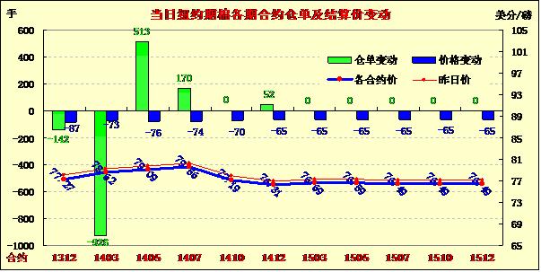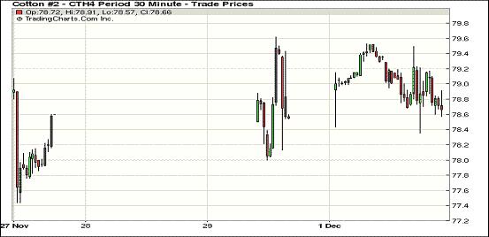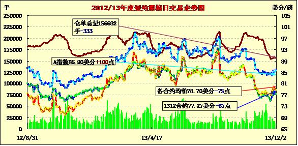 12月2日,美棉供應(yīng)持續(xù)走高及中國拋儲繼續(xù)打壓期棉普遍回調(diào)。近期12月合約收于77.27美分/磅,跌87點(diǎn);主力3月合約結(jié)算價(jià)78.62美分/磅,跌73點(diǎn);1405月合約收于79.09美分/磅,跌76點(diǎn)。期棉開盤后承壓下行,主力3月合約在77.01至78.09區(qū)間震蕩,盤終下跌87點(diǎn),回吐部分上周五所得,市場成交量繼續(xù)減少;外部市場小麥、油籽等期貨下跌,美元指數(shù)上漲。
