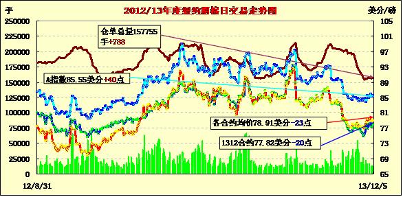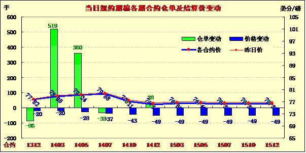 11月5日,基本面利空打擊期棉整體下跌。近期12月合約收于77.82美分/磅,跌20點(diǎn);主力3月合約結(jié)算價(jià)78.85美分/磅,跌20點(diǎn);1405月合約收于79.24美分/磅,跌28點(diǎn)。當(dāng)日期棉開盤后微幅震蕩,主力3月合約盤終跌破79美分至78.85美分/磅,12月合約早盤跌幅較大超百點(diǎn),后有所反彈,盤終略有下跌,6日為該合約最后一個(gè)交易日,市場成交額繼續(xù)縮水。美國農(nóng)業(yè)部數(shù)據(jù),至11.28一周美國凈簽約出口本年度陸地棉56382噸,裝運(yùn)24154噸,凈簽約量相比前一周略有下滑;市場期待USDA發(fā)布WASDE報(bào)告。