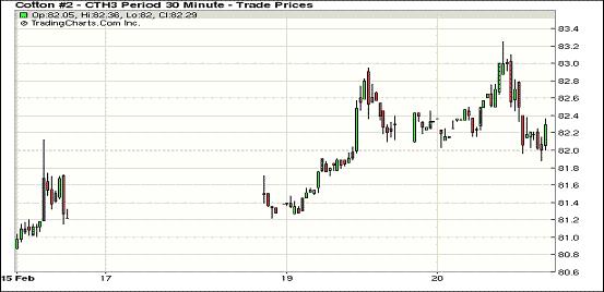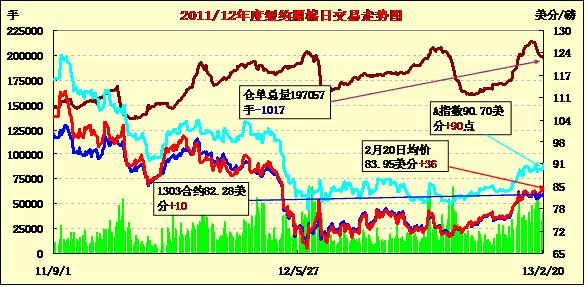 2月20日,受外部谷物市場(chǎng)走高提振,紐約期棉整體收漲,近期3月合約收于82.28美分/磅,漲10點(diǎn);主力5月合約結(jié)算價(jià)84.46美分/磅,漲33點(diǎn)。當(dāng)日市場(chǎng)平穩(wěn)開盤,主力1305月合約早盤運(yùn)行平穩(wěn),基本在84-84.6美分之間震蕩;午盤后突破85美分,當(dāng)日最高至85.24美分/磅,盤終該合約連續(xù)第四個(gè)交易日收漲,繼續(xù)收于2012年5月9日以來高位。當(dāng)日外部大豆、小麥及玉米市場(chǎng)走高,原油期貨收跌。近期3月合約將于本周五進(jìn)入第一交割通知日,目前倉單為12314張。市場(chǎng)傳言中國將于3月份增發(fā)棉花進(jìn)口配額,這對(duì)期棉市場(chǎng)形成支持。