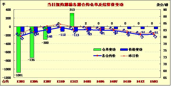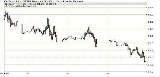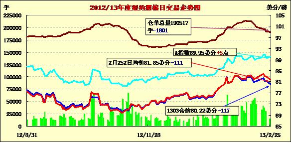 2月25日,紐約期棉全面走低,近期3月合約收于80.22美分/磅,跌117點(diǎn);主力5月合約連續(xù)第三個交易日收跌,當(dāng)日結(jié)算價81.72美分/磅,跌142點(diǎn);其他遠(yuǎn)期合約跌幅51-146點(diǎn)不等。外圍市場走低及缺乏買盤是打壓期棉大跌的主要因素。當(dāng)日市場平穩(wěn)開盤,主力1305月合約早盤在82.6-83美分之間震蕩,因近日期棉區(qū)間震蕩,買盤跟進(jìn)猶豫不決,加之外圍市場走低,期棉在下半場震蕩下行,盤終大幅收跌。5月合約自20日(上周三)觸及年度高位以來,隨后連續(xù)收跌,盤終收于1月28日以來最低位。
