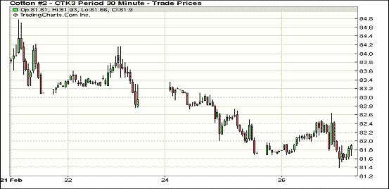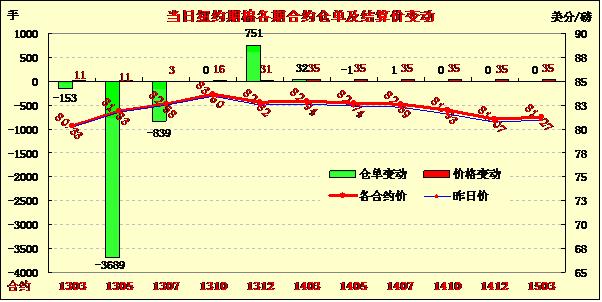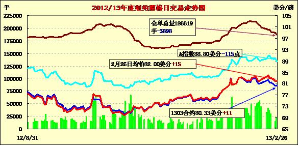 2月26日,受美國聯(lián)邦儲(chǔ)備委員會(huì)主席貝南克暗示將繼續(xù)推行刺激政策提振,美股及外部商品市場(chǎng)普遍收漲,期棉受支持小幅反彈,紐約期棉全面走低,近期3月合約結(jié)算價(jià)80.33美分/磅,漲11點(diǎn);主力5月合約結(jié)算價(jià)81.83美分/磅,漲11點(diǎn);其他遠(yuǎn)期合約也普遍小幅收漲。當(dāng)日市場(chǎng)平穩(wěn)開盤,貝南克在參議院的證詞中著重說明了美聯(lián)儲(chǔ)寬松貨幣政策的益處,隨后美國股市走高,期棉及外部市場(chǎng)也有所上揚(yáng),主力1305月合約當(dāng)日最高至82.64美分,尾盤時(shí)買盤獲利回吐部分漲幅,盤終該合約小幅收漲。