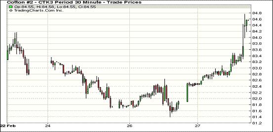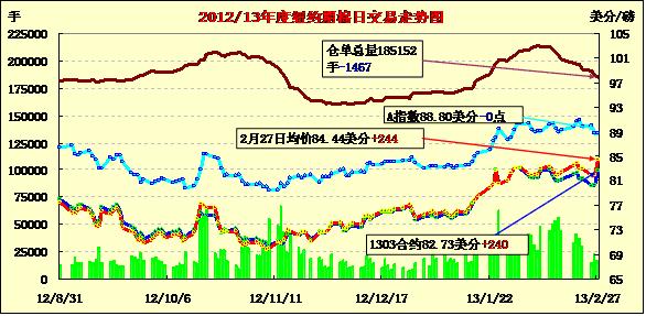 2月27日,市場炒作中國政策促紐約期棉強勢走高,同時美國經(jīng)濟數(shù)據(jù)良好對股市及商品市場也形成整體支持,近期3月合約結(jié)算價82.73美分/磅,漲240點;主力5月合約結(jié)算價84.38美分/磅,漲255點。市場成交量較前幾日也有所上揚。當(dāng)日市場小幅高開,因市場炒作部分中國紡織廠或已經(jīng)收到棉花進口配額,同時中國政府在2013/14年度繼續(xù)實施收儲政策以支撐棉價,期棉受支持一路上揚,主力合約當(dāng)日最高至84.76美分/磅,達到上周高點水平,盤終漲255點,創(chuàng)2012年8月份以來最大單日漲幅。外部股市及商品市場也普遍收漲。