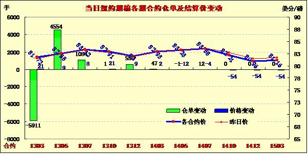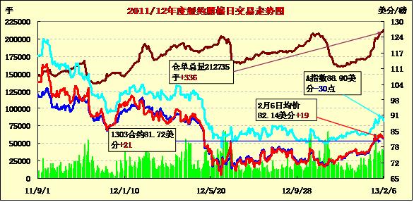 在多個報告發(fā)布前,市場觀望態(tài)度濃厚,2月6日紐約期棉近漲遠(yuǎn)跌,近期3月合約結(jié)算價81.72美分/磅,漲21點,1312月合約82.03美分,漲12點,2014年5月份以后合約小幅下跌。當(dāng)日3月合約小幅高開,早盤未能突破82美分壓力位掉頭向下,最低跌至80.99美分,后在81美分處獲得買盤支撐跌幅縮小,交易最后時段有多單介入,該合約收復(fù)跌幅以小漲收盤。本周四、周五和周六美國將有三個報告出爐,分別是美棉出口周報、全球棉花供需報告和NCC(美國國家棉花總會)面積意向報告,交易商在多個報告發(fā)布前調(diào)整頭寸。