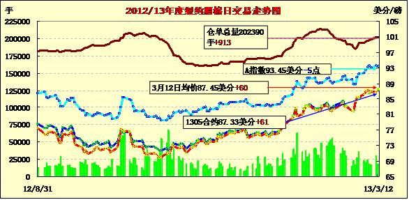 3月12日紐約期棉市場近強遠(yuǎn)弱,近期5月合約結(jié)算價87.33美分/磅,上漲61點,12月合約86.96美分,漲28點,2014年后各合約微幅下跌。5月合約平穩(wěn)開盤,早盤和盤中穩(wěn)定于前一日收盤水平,交易后期受非商業(yè)性買盤支持該合約反彈至87美分以上,并最終收于近高點。分析師指出,市場缺乏根本利好消息,市場走高主要得益于對下年度美棉產(chǎn)量或?qū)p少,出口和國內(nèi)消費預(yù)期增加的預(yù)期。