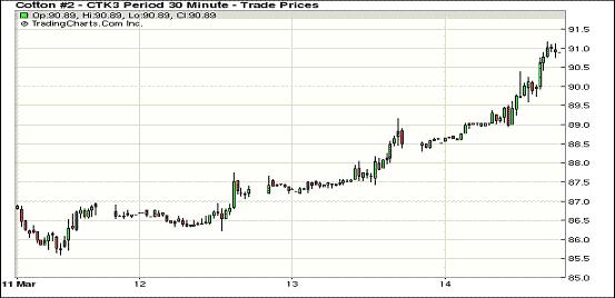 紐約期棉強勢續(xù)揚近期合約破九(3-14)