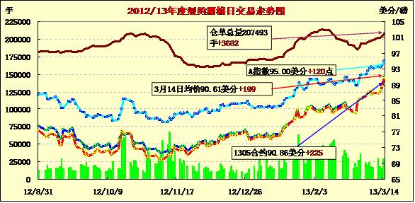 3月14日,紐約期棉市場在非商業(yè)買盤和技術(shù)面支持下繼續(xù)大幅收漲,前兩份合約突破90美分,近期合約結(jié)算價90.86美分/磅,漲225點,12月合約88.54美分,漲103點。美棉出口增加,對市場收于高位形成明顯支持。5月合約穩(wěn)定開盤,上半場交易在89-89.5美分之間波動,交易中期在站上90美分后獲得技術(shù)面支持繼續(xù)穩(wěn)步向上,后期非商業(yè)性買盤繼續(xù)跟進,市場最終收于高位。分析師指出,近期合約強勢上揚,下一步將接受92美分考驗;1212月合約收于88美分以上,或?qū)⑽心厦迏^(qū)三角洲地區(qū)棉農(nóng)種植興趣,走勢能否繼續(xù)上行有待接受考驗。據(jù)美國農(nóng)業(yè)部(USDA)報告,3.1-3.7日一周美國凈簽約出口本年度陸地棉42547噸,相比前一周增加25%,較近四周平均增加14%;裝運80014噸,較前周減少31%,較近四周平均減少16%;凈簽約出口本年度皮馬棉10183噸,達到年度來最高,較前周增加86%;裝運本年度皮馬棉4717噸,較前一周增加45%,較近四周平均增加30%;凈簽約出口2013/14年度陸地棉9185噸、皮馬棉2223噸。