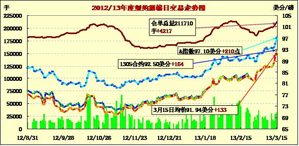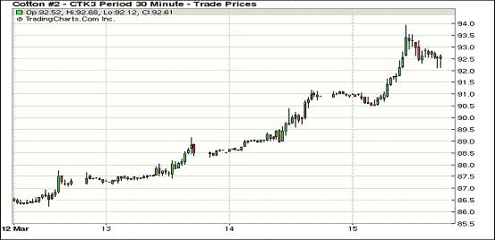 3月15日,紐約期棉市場除1312月合約外全部收漲,近期合約5月合約結(jié)算價92.50美分/磅,漲164點,12月合約88.51美分,跌3點。近期合約上漲主要得益于市場對中國關(guān)于棉花進(jìn)口配額傳聞的炒作和商業(yè)買盤支持。當(dāng)日5月合約早盤穩(wěn)定,上半場交易輕松從91美分上漲到93美分,盤中在此高位盤整后,交易后期在92-93美分之間波動,最后收于該區(qū)間;12月合約上半場走勢與5月合約一致,但最高未能穩(wěn)住89美分后窄幅波動,最終微幅收跌。市場炒作中國將于近期增發(fā)更多棉花進(jìn)口配額的消息,及商業(yè)買盤介入,對近期合約形成支持。