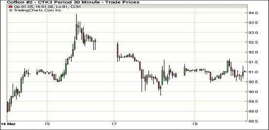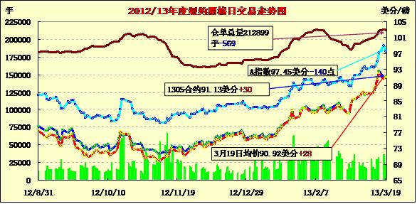 3月19日,拖累市場(chǎng)的塞浦路斯局勢(shì)輾轉(zhuǎn),股市和商品市場(chǎng)漲跌不一,期棉收盤亦漲跌互現(xiàn),近期5月合約結(jié)算價(jià)91.13美分/磅,漲30點(diǎn),12月合約88.26美分,跌13點(diǎn)。當(dāng)日5月合約小幅高開,早盤回到前日收盤前水平,盤中試圖突破92美分挑戰(zhàn)失敗后在90.6-91美分間波動(dòng),交易尾段受買盤托舉收于91美分以上。投資者密切關(guān)注塞浦路斯局勢(shì)進(jìn)展,該國(guó)議會(huì)已經(jīng)否決了國(guó)際貸款方要求的征收銀行存款稅提案。