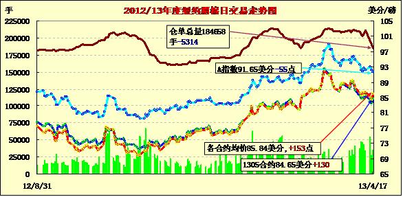 4月17日,紐約期棉結(jié)束前兩個交易日的跌勢低位反彈,近期5月合約結(jié)算價84.65美分/磅,漲130點;7月合約收于86.65美分/磅,漲123點;遠(yuǎn)期12月合約結(jié)算價85.87美分/磅,漲112點;其他遠(yuǎn)期合約也普遍中幅或大幅收漲。市場收漲的主要原因是期棉跌至低位后吸引買家入市。當(dāng)日期棉大部分時間較為平穩(wěn),主力7月合約主要圍繞85.50美分一線震蕩,當(dāng)日最低至85.05美分;尾盤時分價格處于低位的期棉吸引買盤入市,該合約迅速反彈,當(dāng)日最高至87.52美分,震蕩幅度250點,盤終收漲一百余點,為兩周來最大單日漲幅。