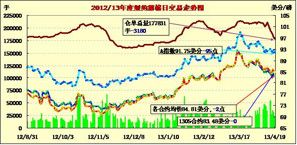 4月19日,紐約期棉多漲少跌,近期5月合約結(jié)算價(jià)83.48美分/磅,不變;7月合約收于85.36美分/磅,跌12點(diǎn);遠(yuǎn)期12月合約結(jié)算價(jià)85.17美分/磅,漲9點(diǎn);其他遠(yuǎn)期合約普遍小幅收漲。當(dāng)日期棉整體運(yùn)行較為平穩(wěn),主力7月合約午后受買盤支持最高至86.15美分,本周主要在85-88美分之間震蕩,7/12月合約價(jià)差為19點(diǎn)。近期5月合約連續(xù)第三周收跌,本周累計(jì)跌210點(diǎn);主力7月合約累計(jì)跌226點(diǎn);遠(yuǎn)期12月合約跌117點(diǎn)。