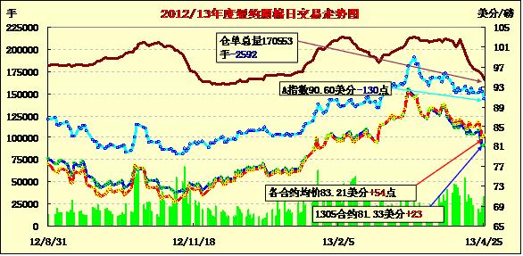 4月25日,紐約期棉多漲少跌,近期5月合約結(jié)算價81.33美分/磅,漲23點;主力7月合約結(jié)算價83.23美分/磅,漲28點;12月合約結(jié)算價83.28美分/磅,跌14點。新一期美棉出口周報數(shù)據(jù)良好及外部商品市場普遍上揚對市場形成支持,同時在前兩個交易日大跌之后,期棉在技術(shù)上略有反彈。當日市場運行平穩(wěn),主力7月合約在83.2-83.8美分/磅之間窄幅震蕩,盤終小幅上揚。該合約在此前兩個交易日累計跌320點,技術(shù)上有反彈需求。當日外部商品市場普遍走高,原油期貨大幅上漲。據(jù)美國農(nóng)業(yè)部(USDA),4.12-4.18一周美國凈簽約出口陸地棉53910噸(較前一周增13%,較近四周平均值均增46%),裝運76204噸(較前一周減15%,較近四周平均值減2%);當周中國凈簽約本年度陸地棉40460噸,裝運38601噸。