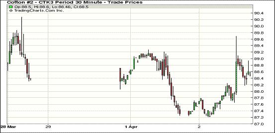 4月2日,市場(chǎng)對(duì)中國(guó)以外的棉花供需情況產(chǎn)生擔(dān)憂,同時(shí)美元走低、美股及外部商品市場(chǎng)多數(shù)上揚(yáng),紐約期棉全面反彈,近期5月合約結(jié)算價(jià)88.87美分/磅,漲148點(diǎn);7月合約結(jié)算價(jià)90.34美分/磅,漲150點(diǎn);12月合約結(jié)算價(jià)87.54美分/磅,漲61點(diǎn)。市場(chǎng)成交量較前幾日也有所放大。當(dāng)日市場(chǎng)平穩(wěn)開(kāi)盤(pán),近期5月合約早盤(pán)在87-88美分區(qū)間震蕩。后國(guó)際棉花咨詢委員會(huì)(ICAC)報(bào)告公布使市場(chǎng)對(duì)中國(guó)之外的供需情況產(chǎn)生擔(dān)憂,期棉強(qiáng)勁反彈。經(jīng)濟(jì)方面,塞浦路斯在實(shí)現(xiàn)預(yù)算方面獲得更多時(shí)間,歐元區(qū)制造業(yè)活動(dòng)數(shù)據(jù)也好于預(yù)期,美元走低、美股及商品市場(chǎng)普遍上揚(yáng),期棉也受到支持。當(dāng)日該合約基本在前一日的震蕩區(qū)間內(nèi)運(yùn)行,盤(pán)終大幅收漲抵消了前一日的跌幅;其他合約也普遍上揚(yáng)。