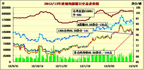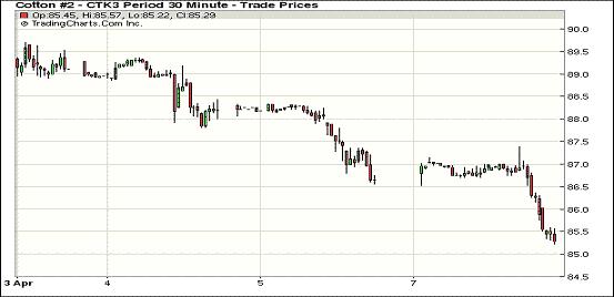 4月8日,雖然外部商品市場全面走高,但紐約期棉在獲利了解賣盤打壓下連續(xù)第三個交易日收跌,近期5月合約結(jié)算價85.38美分/磅,跌141點;7月合約結(jié)算價87.26美分/磅,跌131點;12月合約結(jié)算價85.81美分/磅,跌90點。市場交易活躍,成交量超過5萬手。當(dāng)日市場平穩(wěn)開盤,近期5月合約早盤在86.6-87美分區(qū)間震蕩,后半場獲利了解盤打壓市場快速走低,該合約當(dāng)日最低至85.22美分,為3月4日以來最低點。5月合約在過去三個交易日累計跌384點,錄得10月來最大三日跌幅;12月合約累計跌243點,觸及近三周半新低。分析指出,近幾日市場價差交易及指數(shù)基金轉(zhuǎn)倉活躍。美國農(nóng)業(yè)部(USDA)4月份供需預(yù)測報告將在10日公布,市場保持關(guān)注。