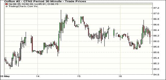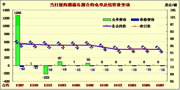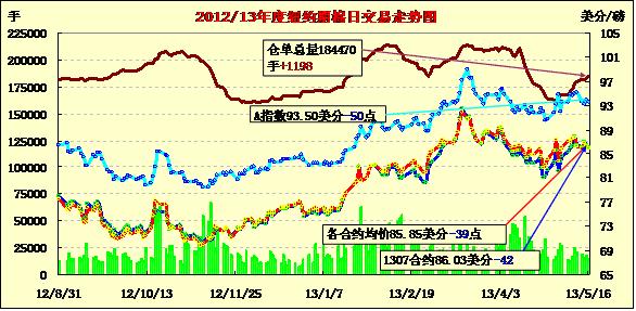 5月16日,紐約期棉在外部谷物商品市場走低影響下繼續(xù)收跌,主力7月合約結算價86.03美分/磅,跌42點;12月合約結算價85.33美分/磅,跌16點。市場交易清淡,當日成交僅為10800萬手,為2012年12月以來最低值。期棉本身當日缺乏方向指引走勢平淡,主力合約基本延續(xù)前一日的震蕩區(qū)間,震蕩幅度106點,7/12合約價差70點。當日外部谷物商品市場普遍走低,原油期貨收高。分析指出,本年度美棉簽約出口量達預計出口總量的99%,實際裝運80%。因中國簽約量上升,上周美棉整體簽約量下降對市場影響不大。