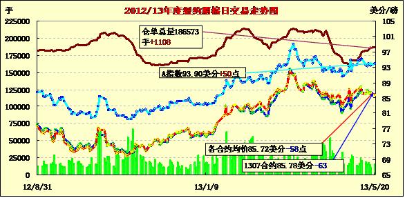 5月20日,紐約期棉整體回落,主力7月合約結(jié)算價(jià)85.78美分/磅,跌63點(diǎn);12月合約結(jié)算價(jià)85.50美分/磅,跌70點(diǎn)。期棉下行的主要原因是市場(chǎng)對(duì)美棉播種進(jìn)度緩慢的憂慮減輕及消費(fèi)買盤衰竭。當(dāng)日市場(chǎng)早盤在美元走低及外部商品市場(chǎng)走高的帶動(dòng)下上行,主力合約基本圍繞86.6美分/磅上下震蕩,后消費(fèi)買盤衰竭對(duì)市場(chǎng)形成壓力,該合約受打壓回落,當(dāng)日最低至85.32美分,盤終收于5月2日以來最低值。7/12月合約價(jià)差縮小至18點(diǎn)。
