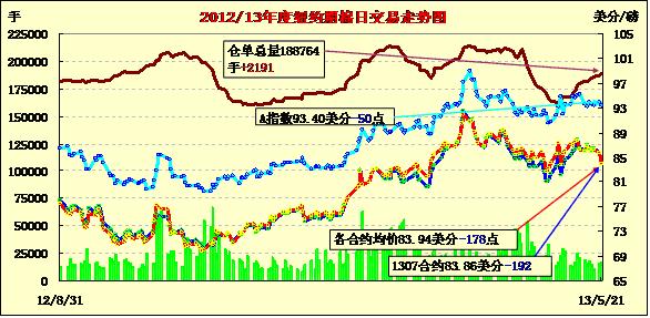 5月21日,受美元走強(qiáng)及外部谷物市場走弱影響,紐約期棉連續(xù)第二個交易日收跌,主力7月合約結(jié)算價83.86美分/磅,跌192點(diǎn);12月合約結(jié)算價84.15美分/磅,跌145點(diǎn);其他遠(yuǎn)期合約也普遍大幅收跌。市場成交量較前幾日有所放大。當(dāng)日期棉小幅低開,主力7月合約上半場在85-85.5美分/磅之間震蕩,后美元走高對商品市場整體施壓,期棉隨谷物市場回落,該合約當(dāng)日最低至83.82美分,盤終創(chuàng)5月1日以來最大跌幅,結(jié)算價為4月25日以來最低值。12月合約較7月合約升水29點(diǎn)。分析指出,美元指數(shù) 上漲,進(jìn)一步打壓以美元計價的原材料價格;此外長期遭遇旱情的德州西部短期內(nèi)將迎來降雨,有利于新花播種及生長,這對棉市形成打壓。