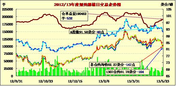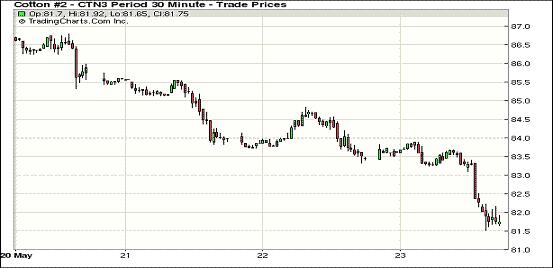 5月23日,在技術性賣盤打壓及中國經(jīng)濟數(shù)據(jù)疲弱引發(fā)需求放緩的擔憂下,紐約期棉全面收低,主力7月合約結算價81.78美分/磅,跌164點;12月合約結算價83.64美分/磅,跌75點。市場成交量較前幾日大幅增加。當日期棉平穩(wěn)開盤,主力7月合約早盤圍繞83.50美分/磅窄幅震蕩,后中國經(jīng)濟數(shù)據(jù)公布對商品市場形成整體壓力,同時期棉在技術性賣盤的打壓下大幅回落,該合約盤終收于1月28日以來最低值。新一期美棉出口周報數(shù)據(jù)符合預期,對市場影響不大。分析指出,匯豐(HSBC)5月份中國制造業(yè)采購經(jīng)理人預覽指數(shù)(PMI)意外萎縮,并降至七個月低點,加劇了市場對中國經(jīng)濟增長放緩的擔憂。